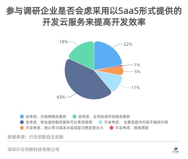 近年來,SaaS模式憑借其用戶體驗(yàn)好、使用簡單、迭代速度快等的特點(diǎn),在國內(nèi)被越來越多的企業(yè)用戶所認(rèn)可。在調(diào)研的企業(yè)中,有83%的企業(yè)表示,愿意接受以SaaS形式提供的開發(fā)云服務(wù)來提高開發(fā)效率,說明絕大多數(shù)企業(yè)都開始對SaaS報(bào)以期待,研發(fā)上云的大勢逼近。其中,已經(jīng)開始使用SaaS的企業(yè)也已經(jīng)達(dá)到了22%,還有61%的企業(yè)有可能研發(fā)上云,這是一個(gè)巨大的市場機(jī)會(huì)。