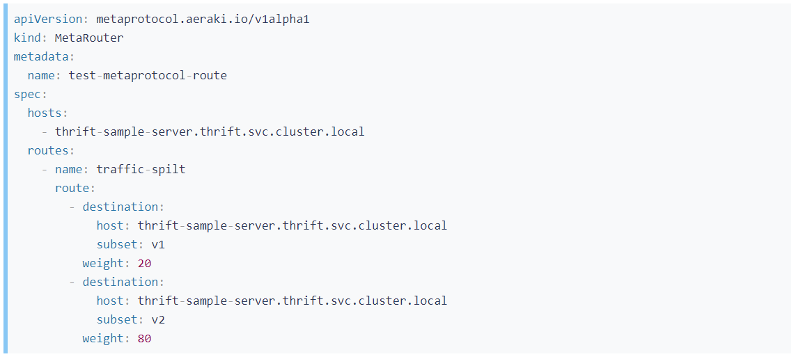 MetaRouter您可以通過CRD更改路線。例如:將 20% 的請求發(fā)送到 v1,將 80% 的請求發(fā)送到 v2: