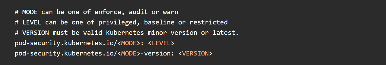 Pod Security 準(zhǔn)入與內(nèi)置的 Pod Security 準(zhǔn)入控制器配合使用;您需要在集群中使用 –feature-gates=”...,PodSecurity=true” 或使用 pod admission webhook啟用此功能。它應(yīng)用于 命名空間級別,帶有以下標(biāo)簽: