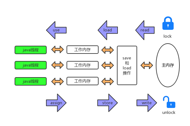 可以看到,圖中一共有三個區(qū)域,線程執(zhí)行區(qū)、工作內(nèi)存、主內(nèi)存,其中線程執(zhí)行區(qū)和工作內(nèi)存是線程獨(dú)享的,也就是線程隔離的,而主內(nèi)存也就是我們常說的堆里面存儲對象實(shí)例數(shù)據(jù)所占用的內(nèi)存,是線程共享的。JVM定義了8種內(nèi)存間的交互操作,分別如下: