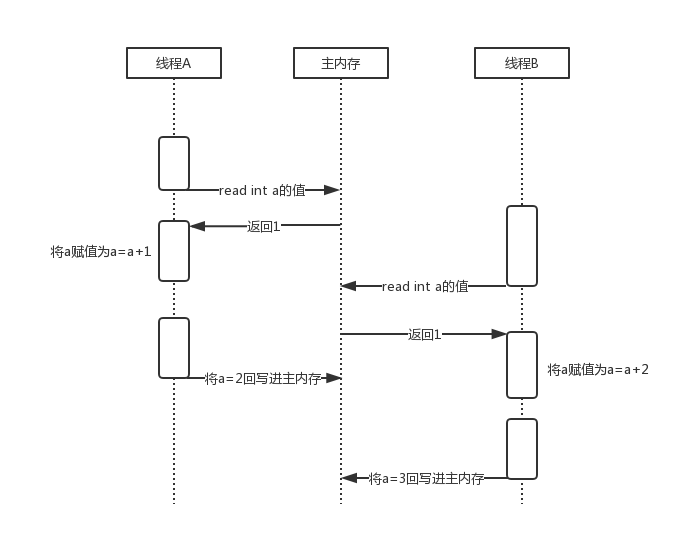 上圖是最基本的多線程并發(fā)修改的示例圖,兩個線程同時對一個變量值a進(jìn)行賦值操作,根據(jù)Java內(nèi)存模型中定義的那幾步操作來看,如果說不加鎖控制的情況下,會發(fā)生如圖中所示的場景,整形變量a初始值等于1,線程A對變量a進(jìn)行加1操作,線程B對變量a進(jìn)行加2操作,按理a最終應(yīng)該為4,但是由于發(fā)生了并發(fā)修改,導(dǎo)致a最終為3,原因很簡單,線程A在工作內(nèi)存中修改了變量a的值,但是還沒有往主內(nèi)存中寫的時候,線程B已經(jīng)從主內(nèi)存中讀取變量a的值進(jìn)行操作了,由于工作內(nèi)存是線程隔離的,因此線程B并不知道線程A修改了變量a的值,導(dǎo)致線程B讀取變量a的值是線程A修改之前的值,這個時候就發(fā)生了多線程的并發(fā)修改問題。因此,為了避免這種情況發(fā)生,我們應(yīng)該對多線程的并發(fā)修改做控制,也就是今天的主題,進(jìn)程內(nèi)的多線并發(fā)控制。