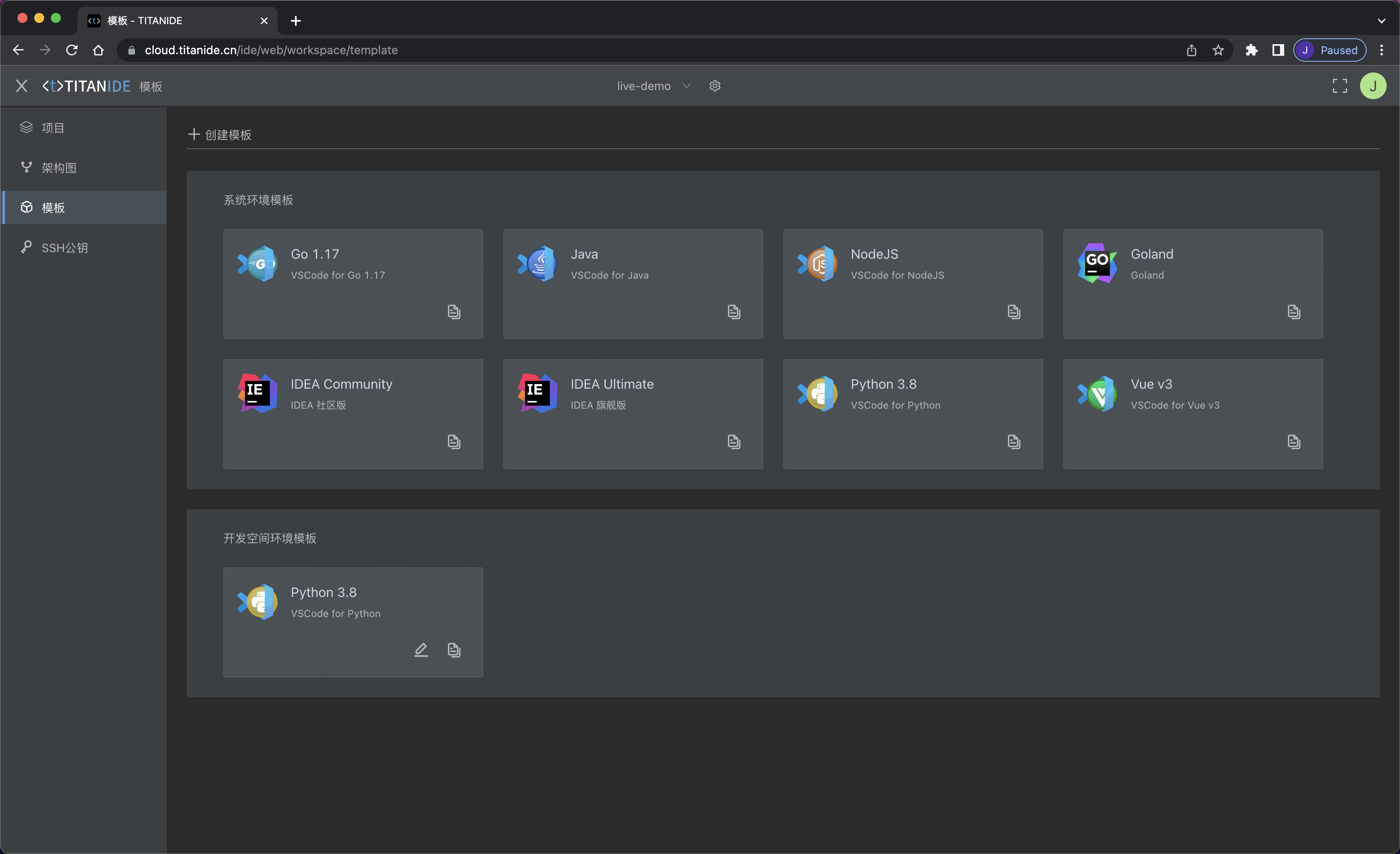TITANIDE(在線IDE) 是采用 B/S 架構(gòu)設(shè)計(jì)的云原生集成開(kāi)發(fā)環(huán)境,內(nèi)置了業(yè)界主流的IDE,讓您能夠更快速的啟動(dòng)一個(gè)您所熟悉的 IDE,不管您以前是使用 VS Code、WebStorm、Intellij IDEA、Goland、Pycharm,總有一款適合您。您無(wú)需搭建開(kāi)發(fā)環(huán)境,只需要打開(kāi)瀏覽器就能編寫(xiě)并運(yùn)行、調(diào)試您的項(xiàng)目代碼,從而聚焦您業(yè)務(wù)。