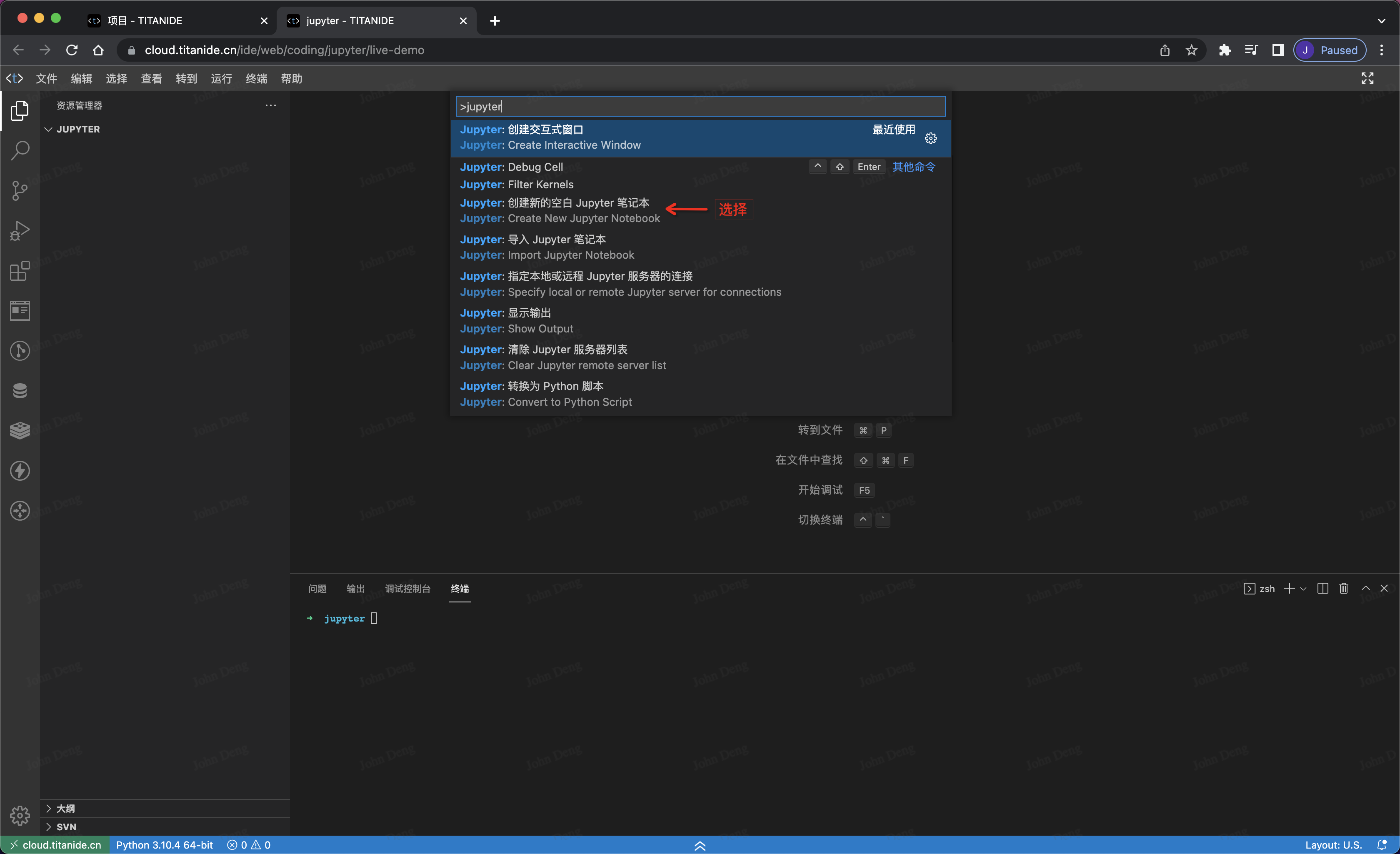 Mac 用戶通過(guò)快捷鍵 Command + Shift + P 打開(kāi)命令操作面板;Windows 用戶通過(guò)快捷鍵 Ctrl + Shift + P 打開(kāi)命令操作面板。創(chuàng)建新的 Jupyter Notebook。