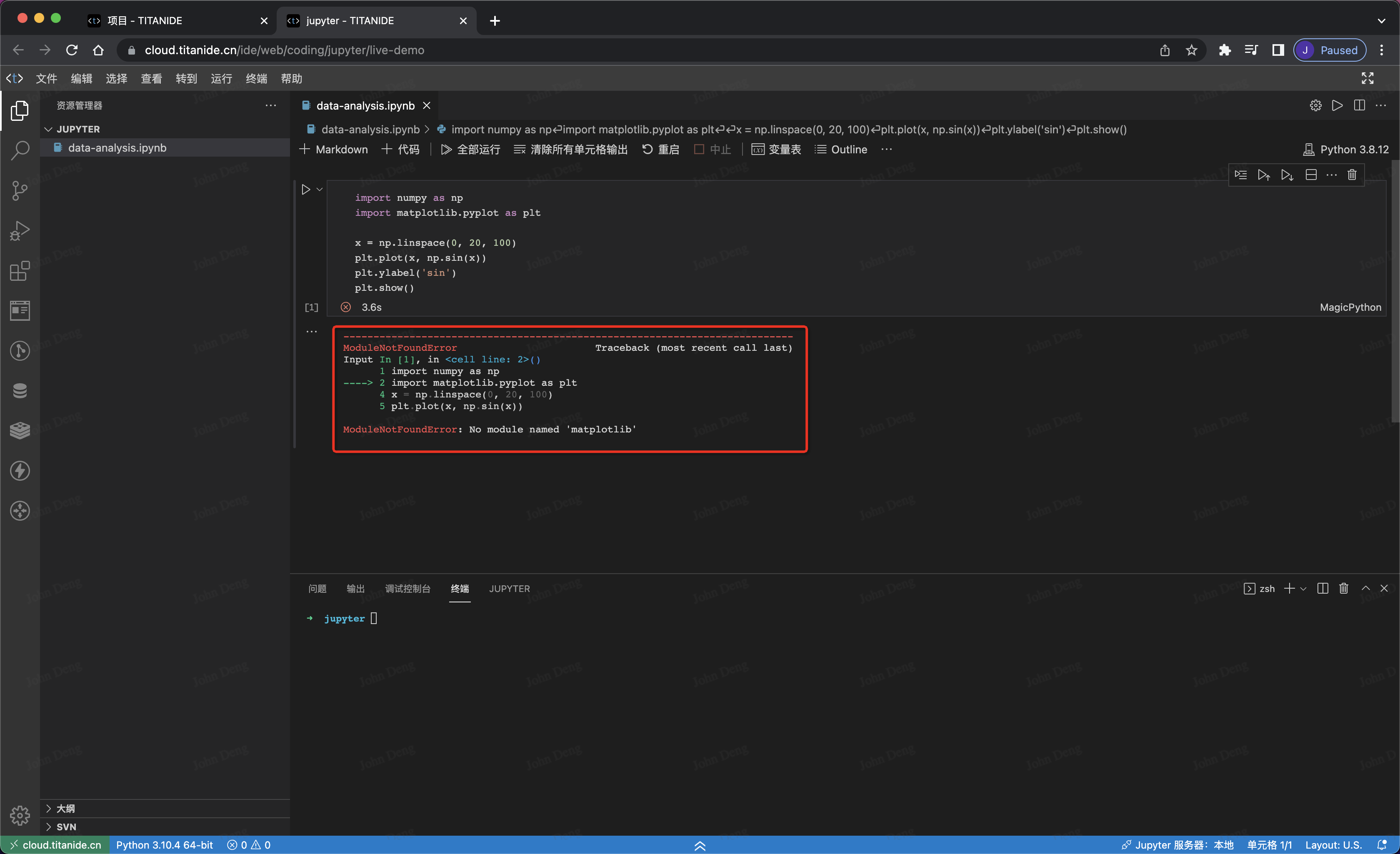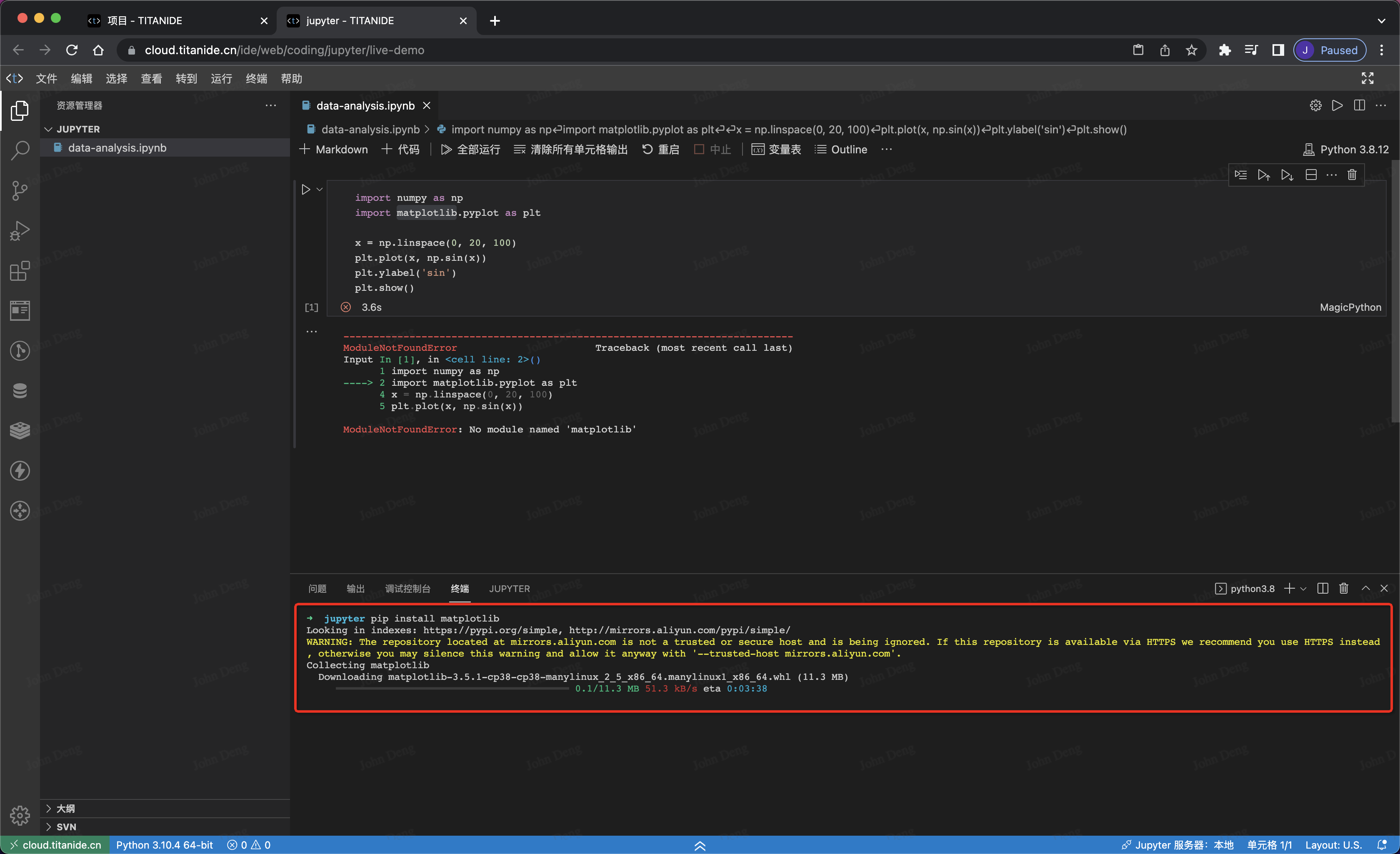 在 Jupyter 代碼單元格編寫(xiě)代碼,在這里,我們將輸出一個(gè)正玄波。第一次運(yùn)行會(huì)提升模組未安裝的錯(cuò)誤信息: