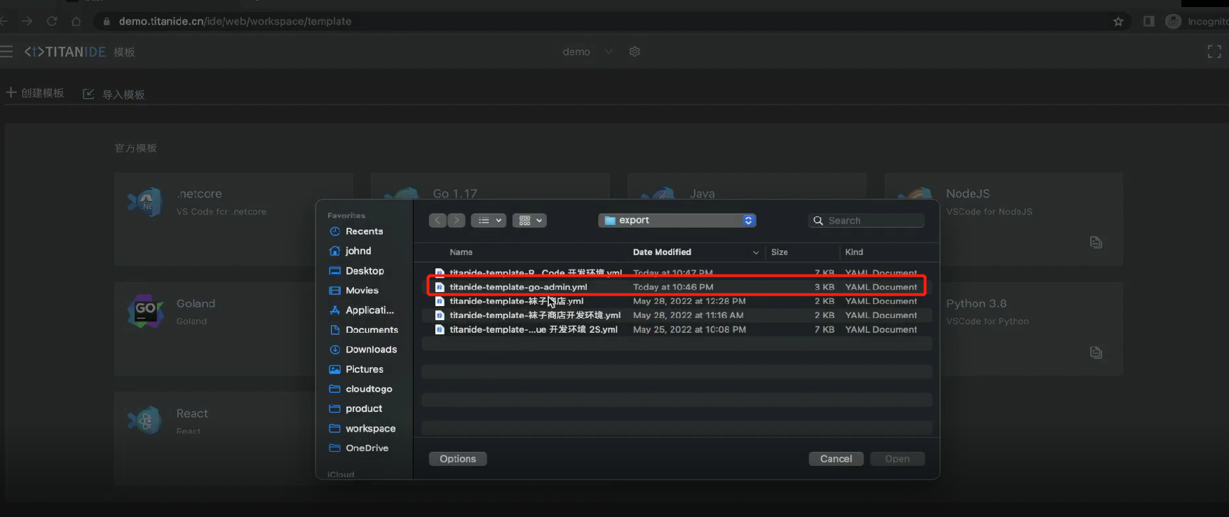 將事先配置好的 Go Admin 開發(fā)環(huán)境模板導(dǎo)入到我的工作空間