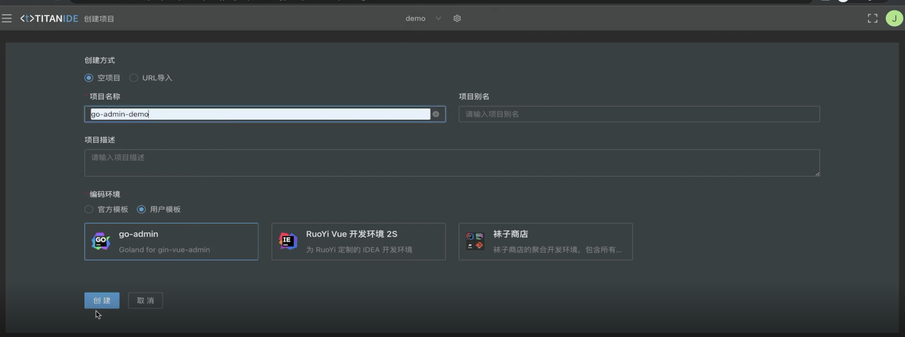 直接點(diǎn)擊剛導(dǎo)入的 Go Admin 開發(fā)環(huán)境模板,輸入您的項(xiàng)目名稱,一鍵創(chuàng)建 Go Admin 開發(fā)環(huán)境。
