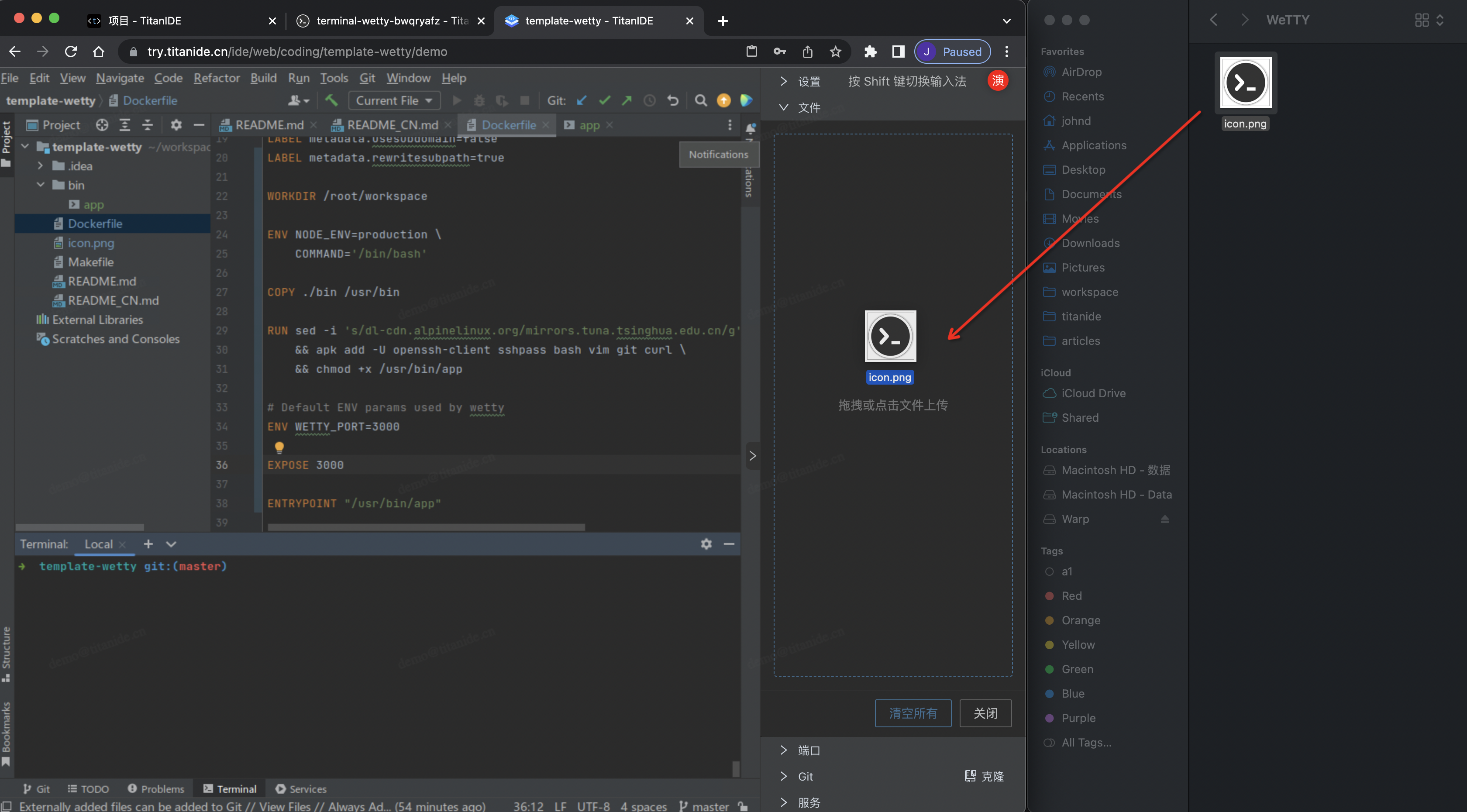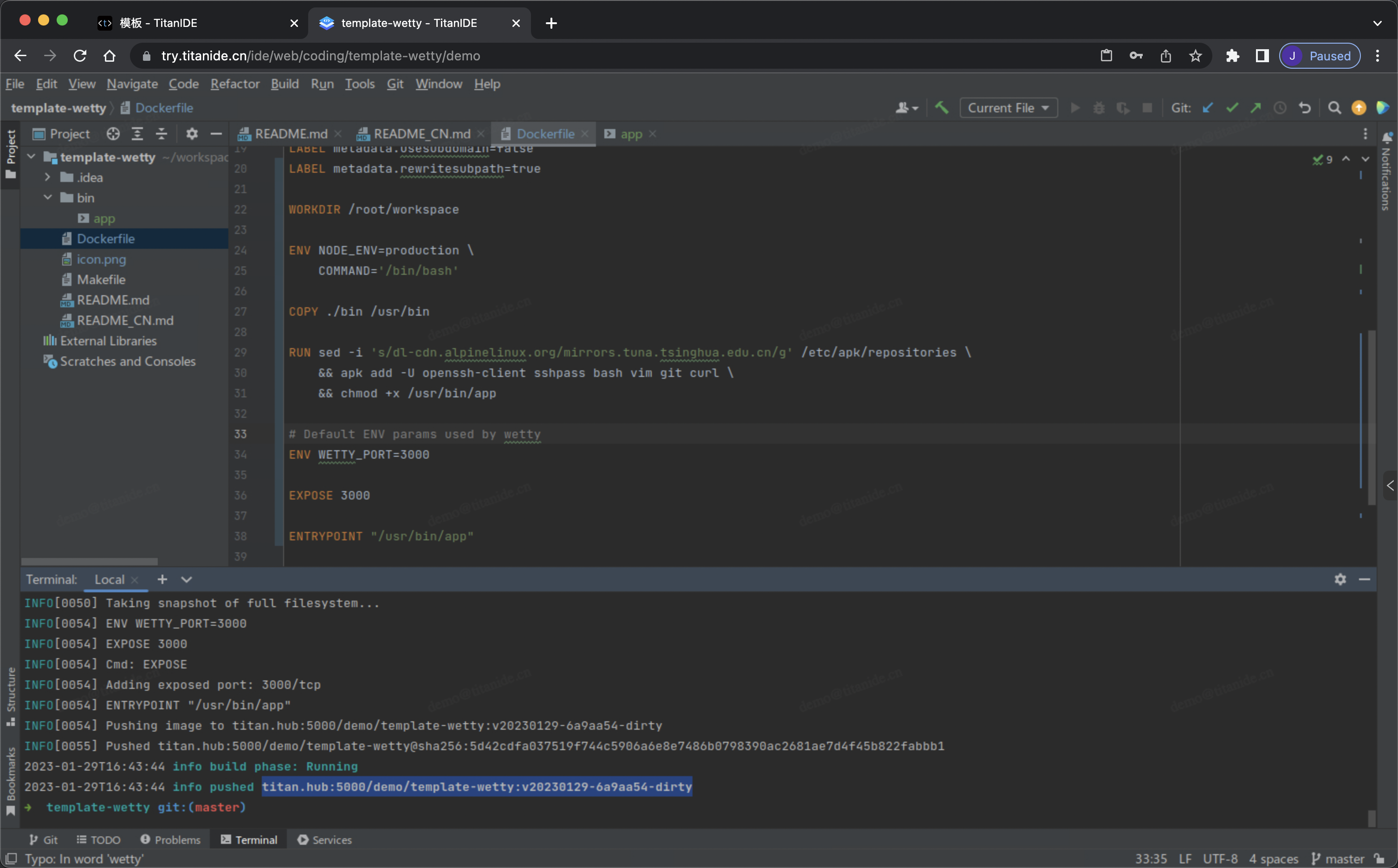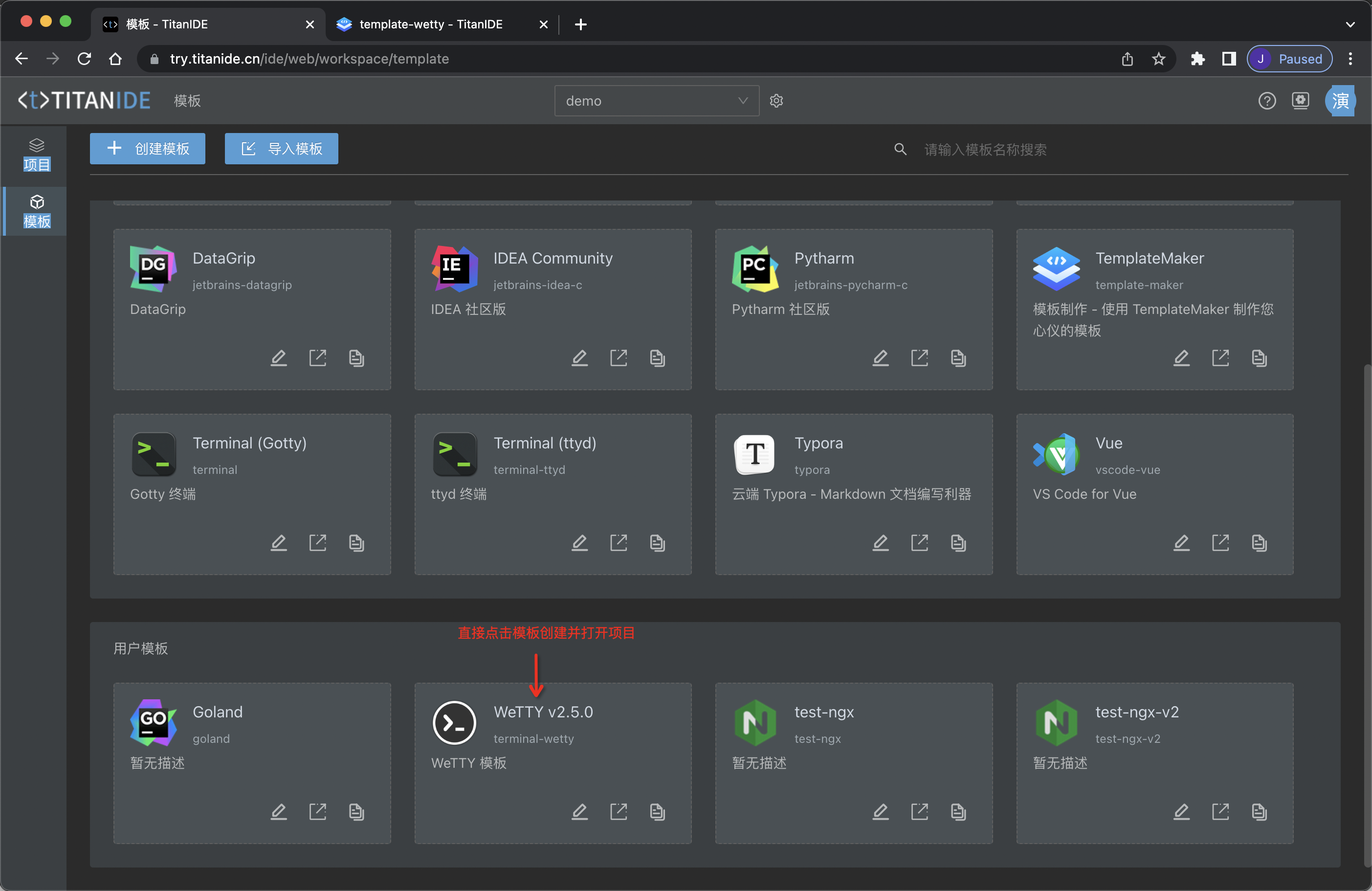在 TitanIDE 上構(gòu)建模板鏡像,需要通過(guò) TemplateMaker 模板來(lái)創(chuàng)建一個(gè)項(xiàng)目 template-wetty。