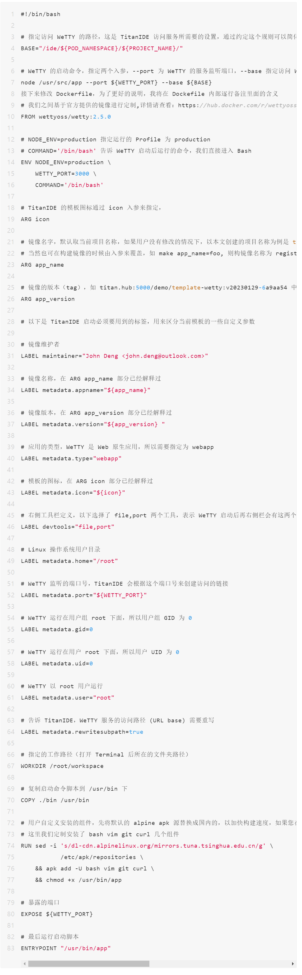 WeTTY 官方鏡像默認(rèn)使用 alpine 基礎(chǔ)鏡像,而 WeTTY 也主打遠(yuǎn)程 SSH 連接,對(duì)于 TitanIDE 這種開(kāi)發(fā)環(huán)境來(lái)說(shuō),不是很友好,alpine 作為服務(wù)運(yùn)行很好,但是作為開(kāi)發(fā)環(huán)境就力不從心了。