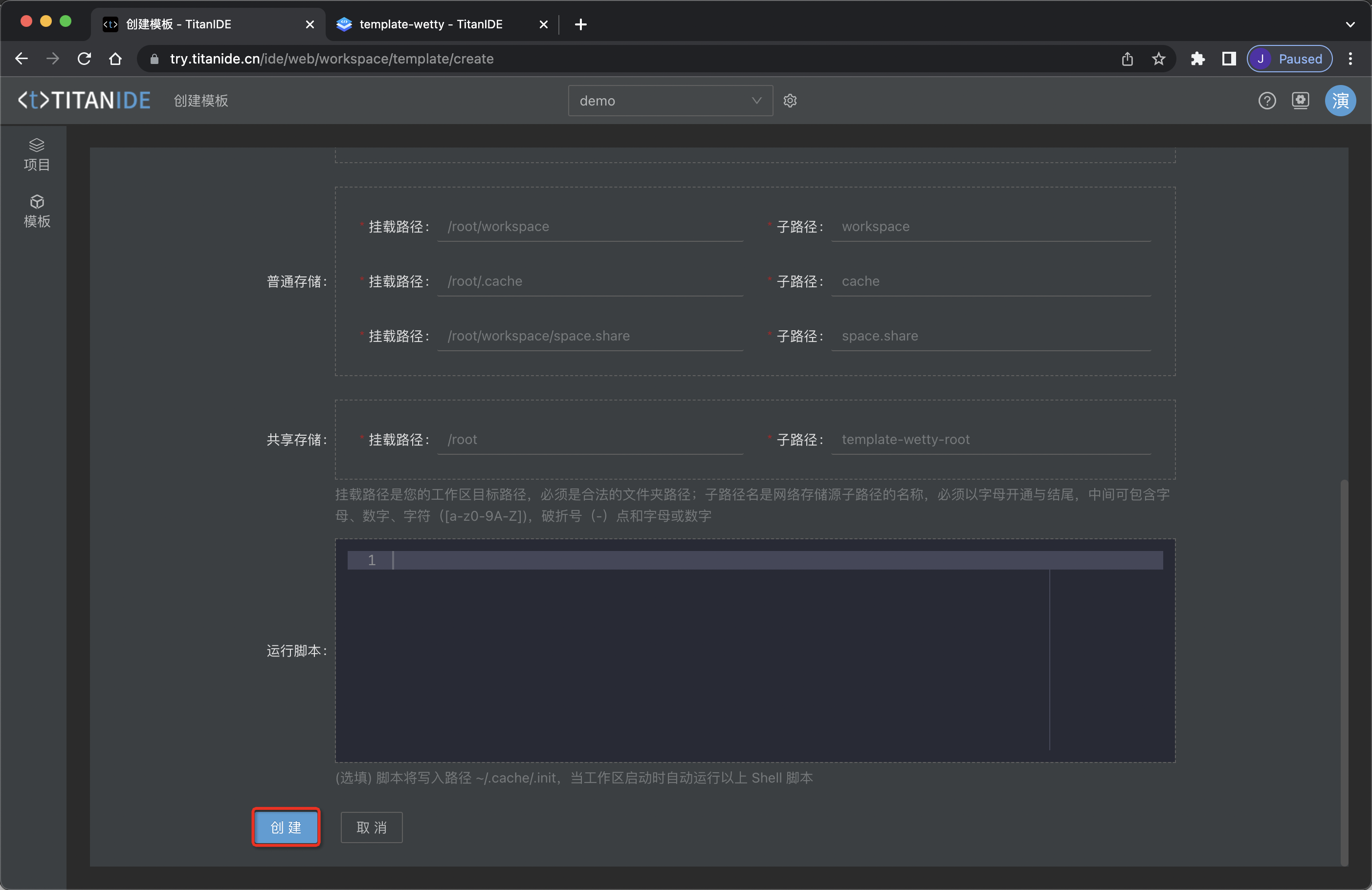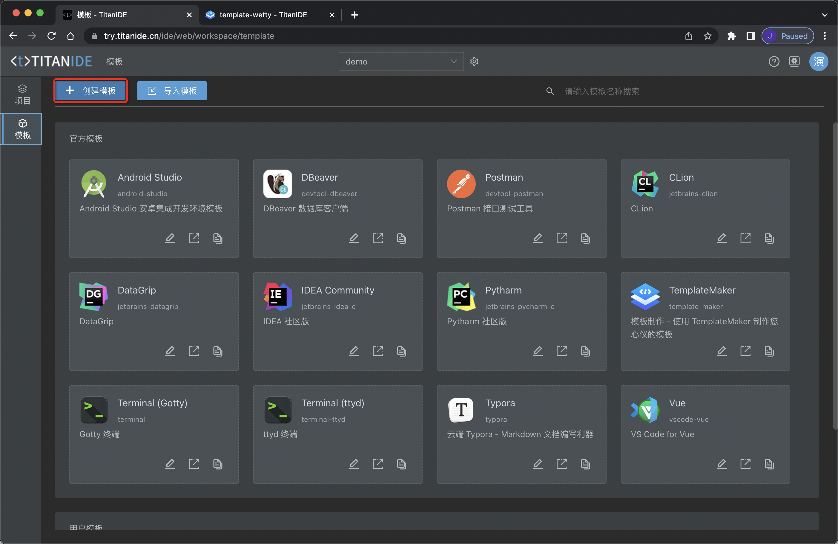 通過(guò)簡(jiǎn)單的兩步,再點(diǎn)擊「創(chuàng)建」即可創(chuàng)建好 TitanIDE 的模板。
