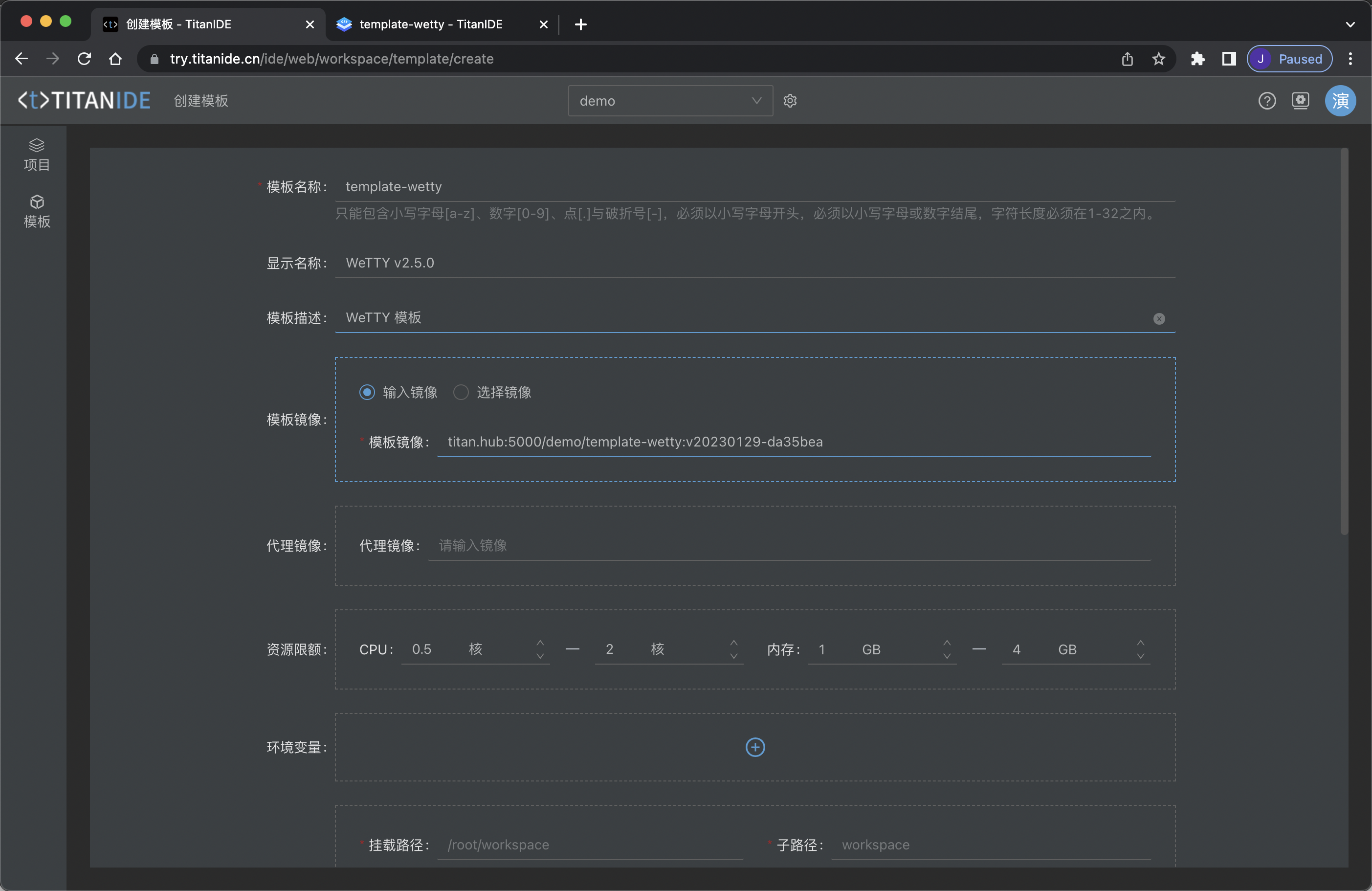 將之前復(fù)制好模板鏡像 URL (例如:titan.hub:5000/demo/template-wetty:v20230129-da35bea)粘貼到模板鏡像輸入框,再指定模板名稱(chēng),除了以上項(xiàng)必填之外,其它為選填項(xiàng),您可以根據(jù)需要來(lái)填寫(xiě),如顯示名稱(chēng),模板描述等。