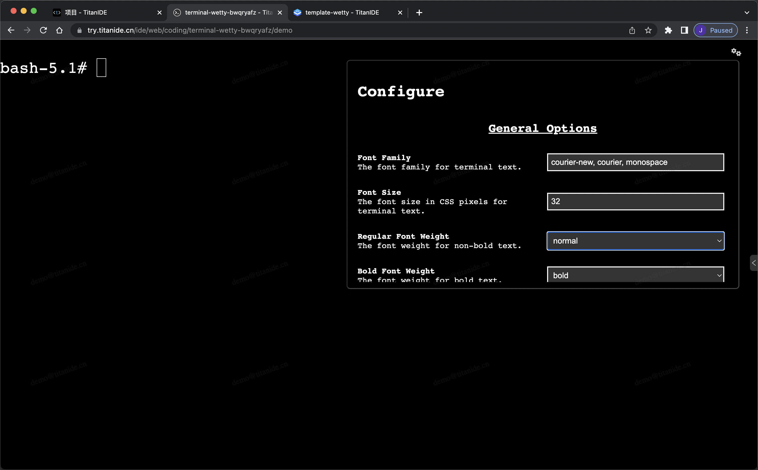 總體來(lái)說(shuō) WeTTY 是一個(gè)不錯(cuò)的 Web 終端,簡(jiǎn)單的幾步就構(gòu)建了一個(gè) TitanIDE 模板鏡像,并用它新建項(xiàng)目,直接打開(kāi)使用。從使用的角度來(lái)看,功能和性能都很不錯(cuò),也可以在頁(yè)面直接定制字體,主題顏色,操作系統(tǒng)適配等等。如果作為一般用途,比如代替 xshell 等工具做運(yùn)維相關(guān)工作還是很有競(jìng)爭(zhēng)力的。但是希望用 WeTTY 來(lái)作為日常開(kāi)發(fā)用,我相信也是可以的,不過(guò)這就需要花更多的時(shí)間去折騰了。