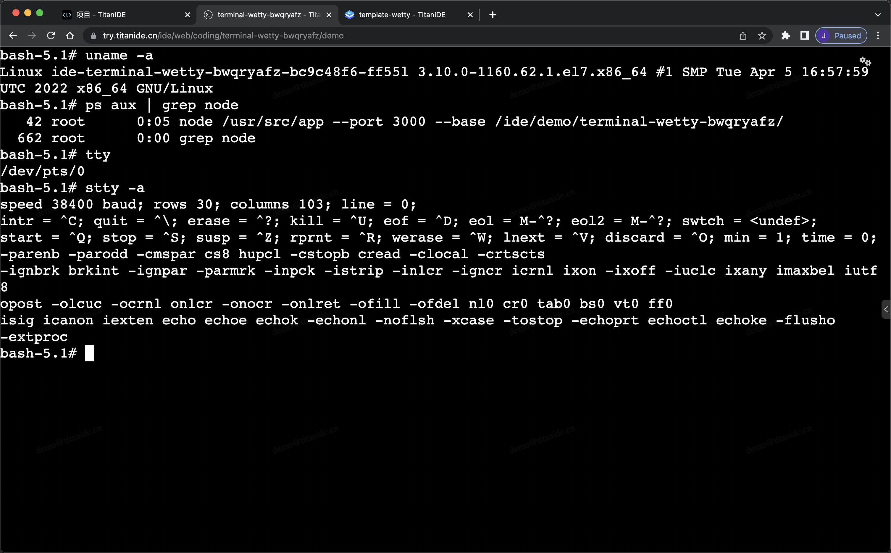 根據(jù)我們?cè)谏弦黄恼隆对?TitanIDE 玩轉(zhuǎn)云原生 Terminal 系列(一):TTY 的前世今生》所了解到的,我們?cè)?WeTTY 終端來(lái)驗(yàn)證一下 tty stty -a幾個(gè)命令。