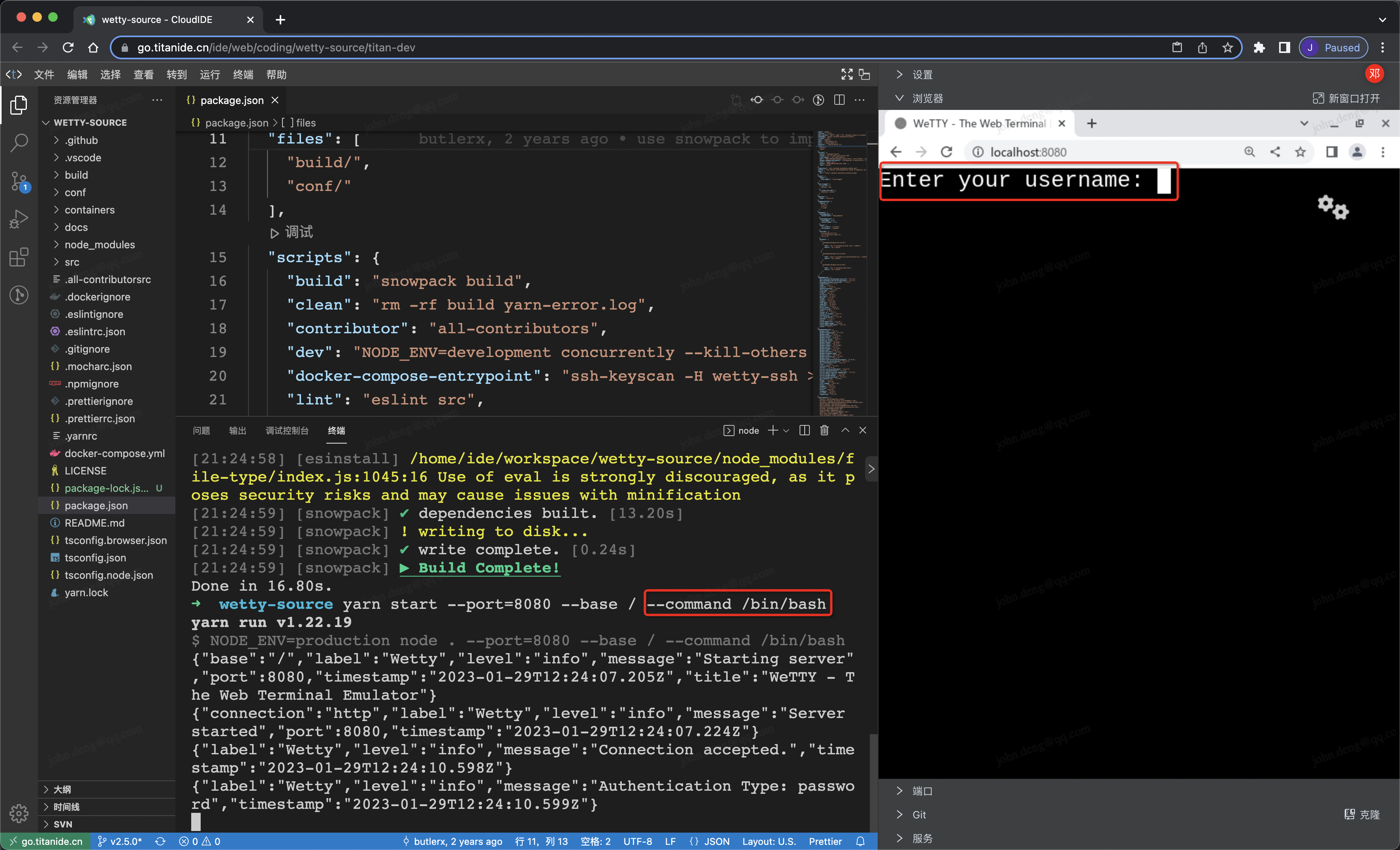 上圖是我在 TitanIDE 創(chuàng)建了一個(gè) VS Code 項(xiàng)目,克隆了 WeTTY 源碼并運(yùn)行起來(lái)了,指定了 --command 卻不起作用,下面是完整的啟動(dòng)命令。