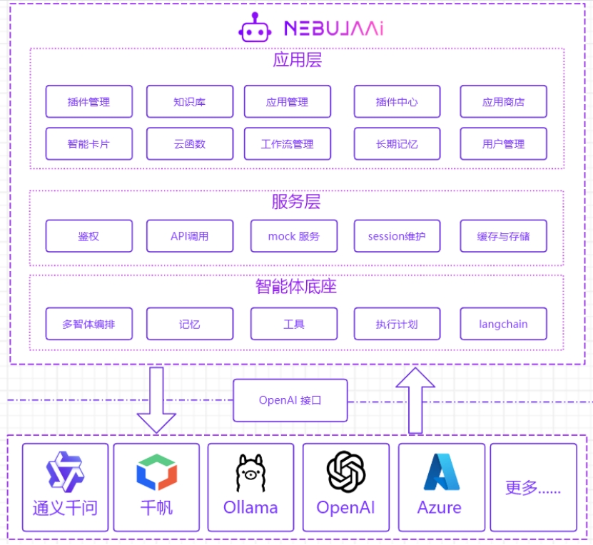NebulaAI 支持對(duì)接各種大語(yǔ)言模型,涵蓋本地私有大模型、國(guó)內(nèi)領(lǐng)先的公有大模型和國(guó)外知名的公有大模型等,我們提供靈活對(duì)接接口,滿足企業(yè)不同業(yè)務(wù)場(chǎng)景的需求。