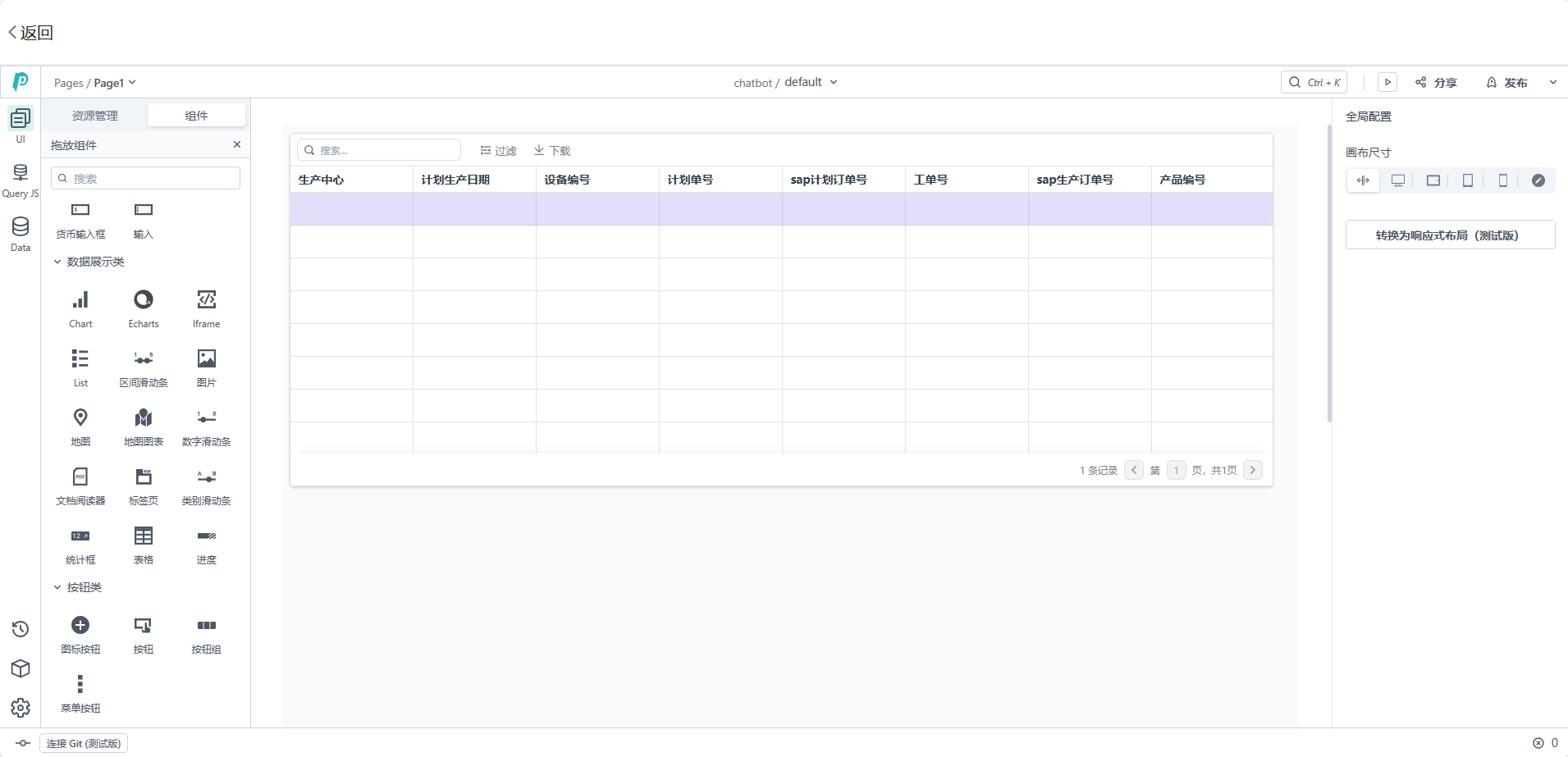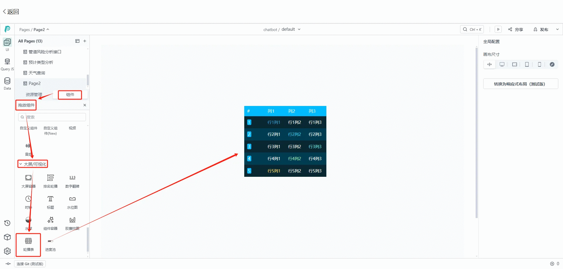 在卡片應(yīng)用選擇想要生成組件呈現(xiàn)樣式,例,生成輪播表;點(diǎn)擊“組件”-->選擇“拖動(dòng)組件”-->選擇“大屏/可視化”-->選擇“輪播表”,拖動(dòng)到“PagePlug”應(yīng)用頁(yè)面,能自由調(diào)整輪播表的大小、顏色等。接著選擇表頭,對(duì)表頭數(shù)據(jù)進(jìn)行修改。修改完后,即可點(diǎn)擊“發(fā)布”。