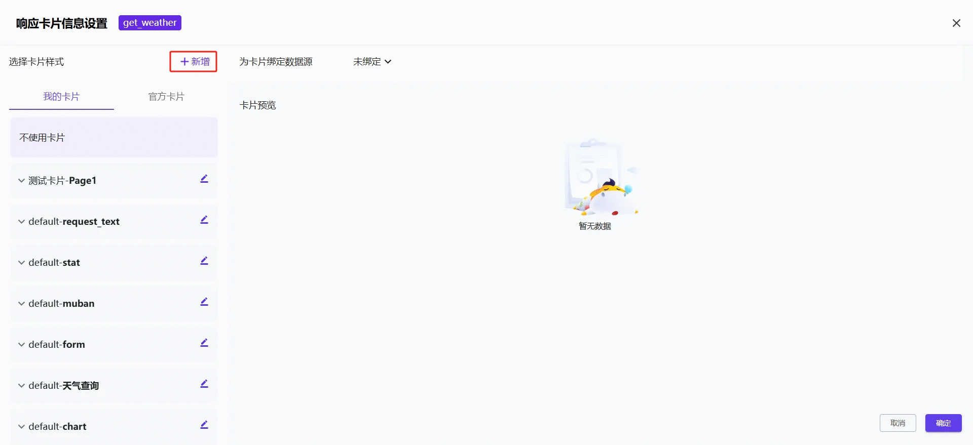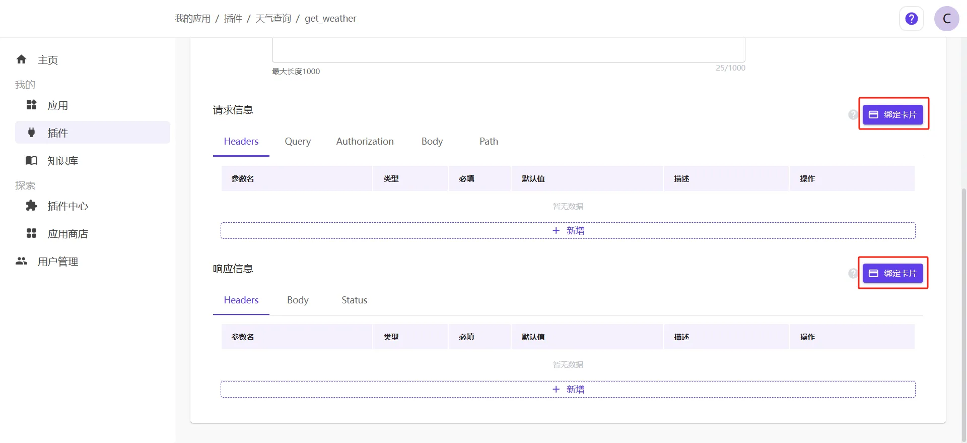 首先需要在“插件—技能”內(nèi)綁定一個(gè)卡片應(yīng)用。例,點(diǎn)擊:我的-->插件—“天氣查詢”-->編輯技能-->請(qǐng)求信息/響應(yīng)信息-->綁定卡片。