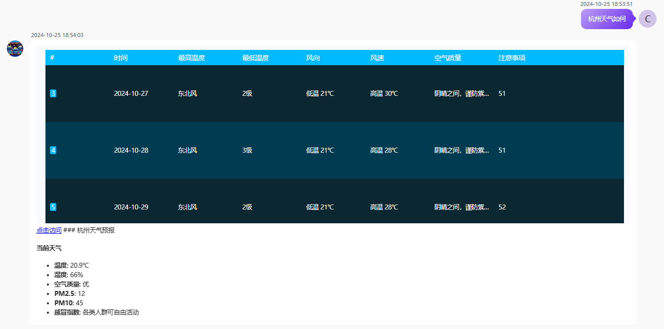 在“天氣查詢”智能體應(yīng)用,即可使用天氣查詢來(lái)獲得卡片信息。