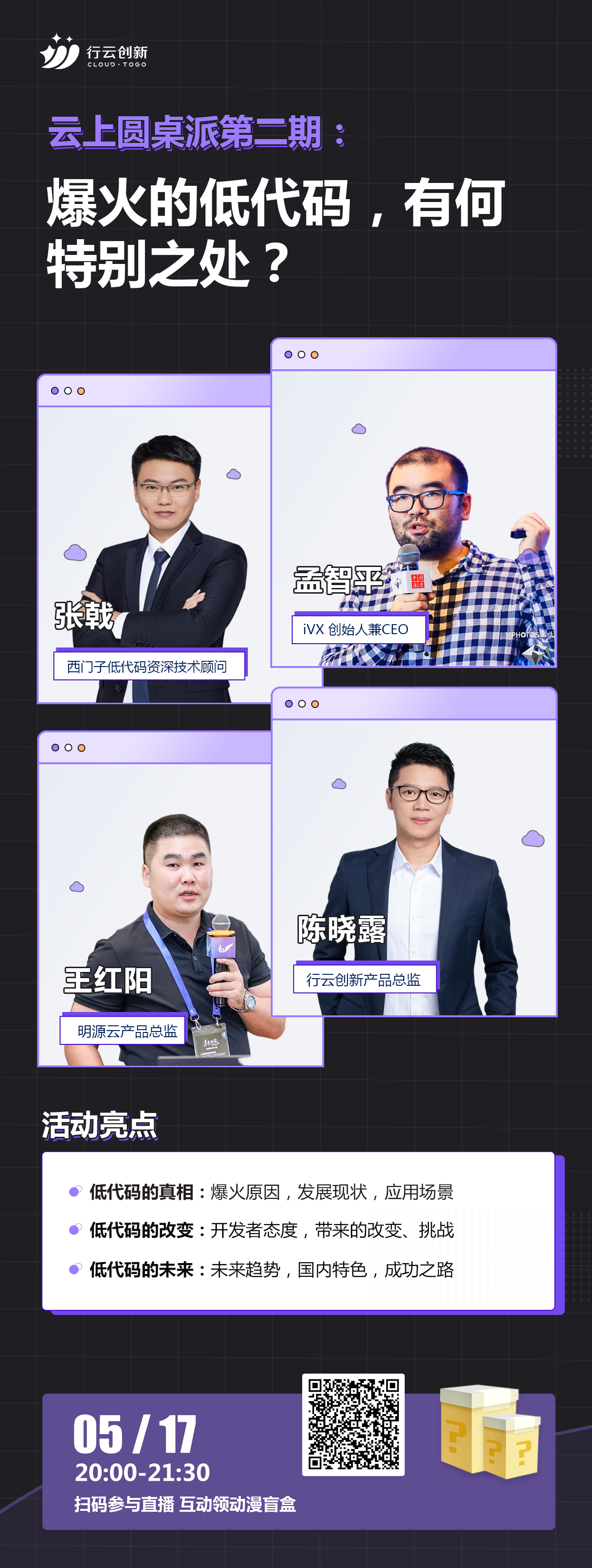 5月17日20:00《云上圓桌派第二期:爆火的低代碼,有何特別之處》直播來啦!活動邀請西門子工業(yè)軟件西門子低代碼資深技術(shù)顧問張戟,iVX 創(chuàng)始人兼CEO孟智平,明源云產(chǎn)品總監(jiān)王紅陽,kaiyun開云創(chuàng)新產(chǎn)品總監(jiān)陳曉露四位大咖和kaiyun開云創(chuàng)新CEO馬洪喜一起對低代碼爆火背后的原因、開發(fā)者對低代碼的態(tài)度、低代碼帶來的變化和應用場景等多個話題展開討論。