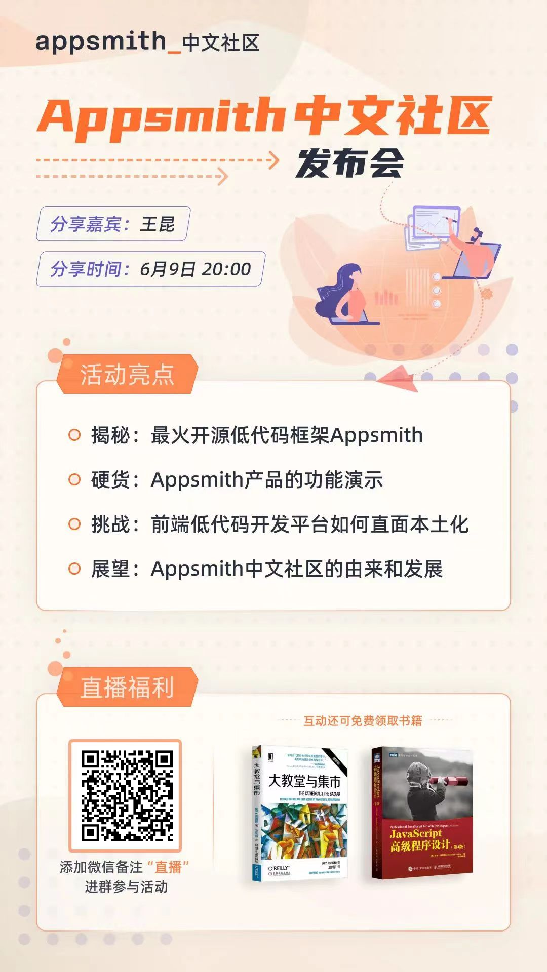 想了解這款Github上最火的低代碼平臺(tái)?6月9日20:00,Appsmith 中文社區(qū)將舉行線上發(fā)布會(huì)!活動(dòng)將進(jìn)一步講解Appsmith的功能特色,分享前端低代碼平臺(tái)如何直面本土化發(fā)展,并重磅介紹Appsmith中文社區(qū)的由來(lái)和發(fā)展!