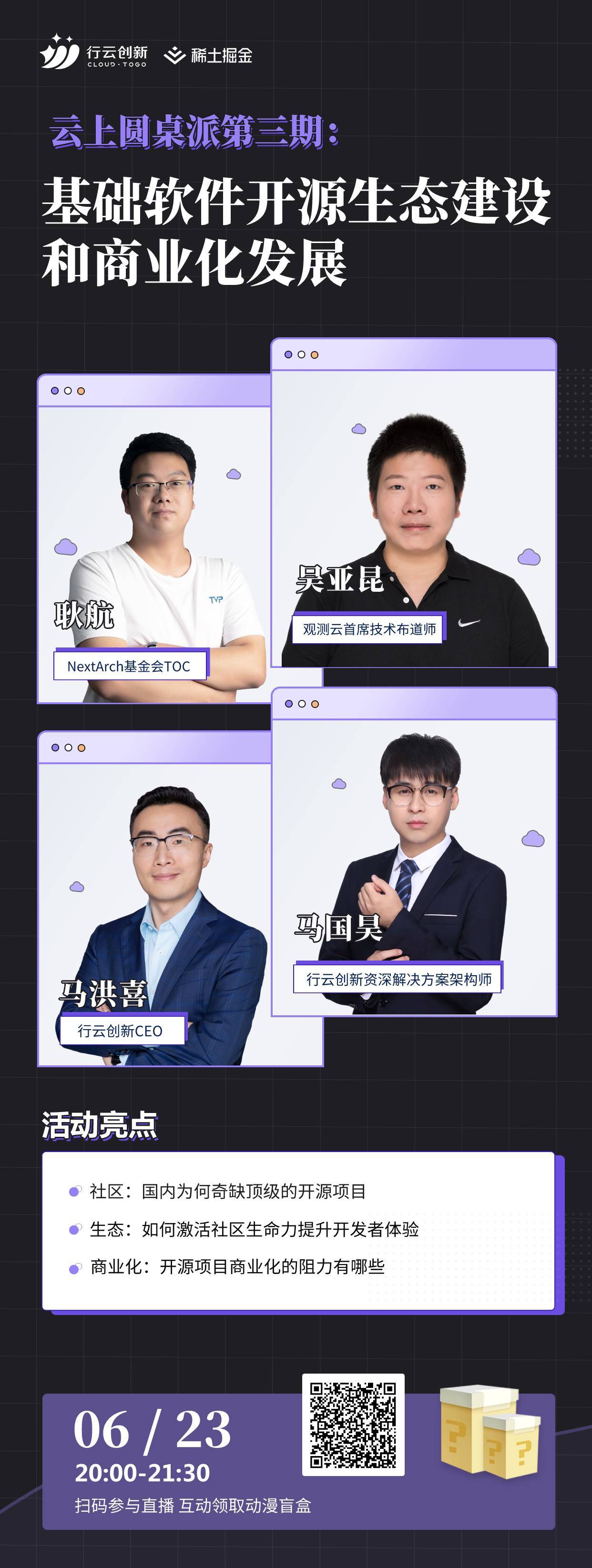 6月23日晚上20:00,云上圓桌派第三期《基礎(chǔ)軟件開源生態(tài)建設(shè)和商業(yè)化發(fā)展》即將開啟,活動(dòng)邀請(qǐng)NextArch基金會(huì)TOC耿航,觀測(cè)云首席技術(shù)布道師吳亞昆,kaiyun開云創(chuàng)新資深解決方案架構(gòu)師馬國(guó)昊三位大咖和kaiyun開云創(chuàng)新CEO馬洪喜一起對(duì)國(guó)內(nèi)的開源生態(tài)現(xiàn)狀、社區(qū)的建設(shè)及商業(yè)化發(fā)展等多個(gè)問(wèn)題一起展開討論。